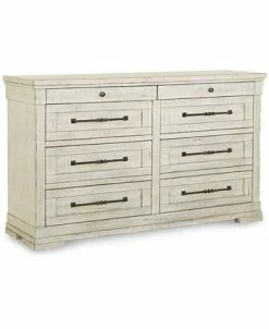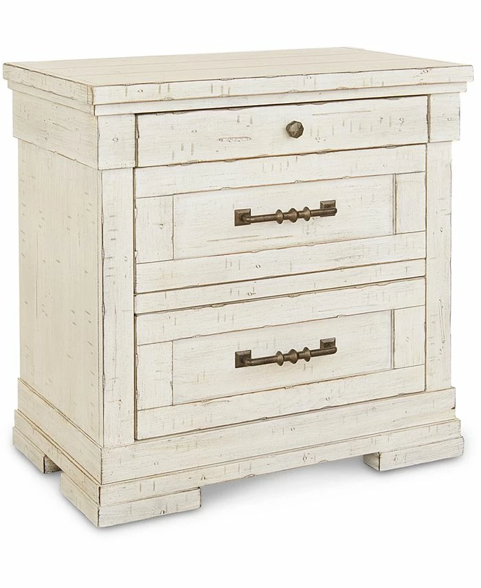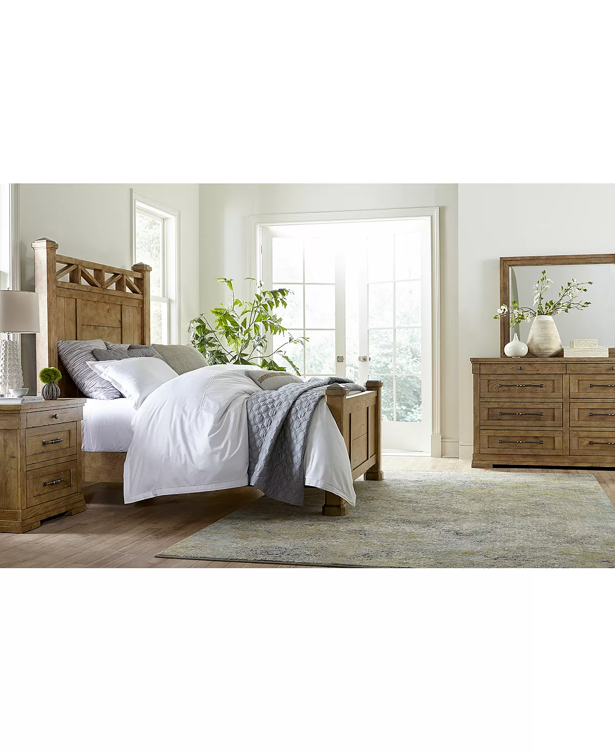 A classic, cool beachside vibe. Sleek lined case pieces offset by ornate hardware and molding accents are complemented by the plank-style design and burnished pewter-tone capped bed posts of this three-piece king bed set. In a grainy-look wheat or crisp distressed off-white finish, this handsome set embodies chic vintage-inspired style while conveying a delightful, laid-back character.